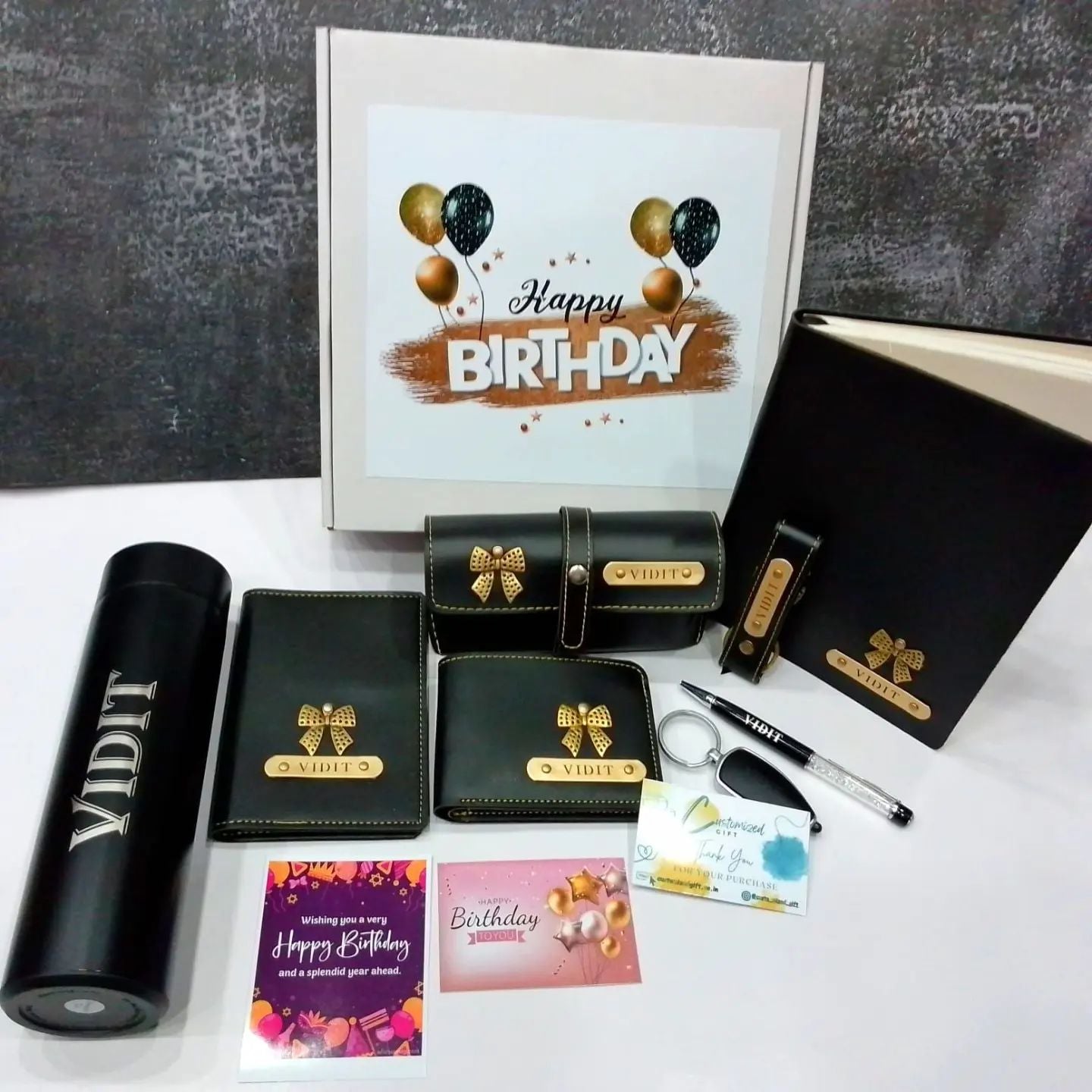 Introducing the Ultimate Birthday Bliss Combo for Men - an exquisite ensemble designed to make his special day unforgettable! This thoughtfully curated set includes a personalized wallet, keychain, passport cover, specs cover, diary, temperature bottle, and a pen with an LED keychain, all wrapped in premium birthday packaging.