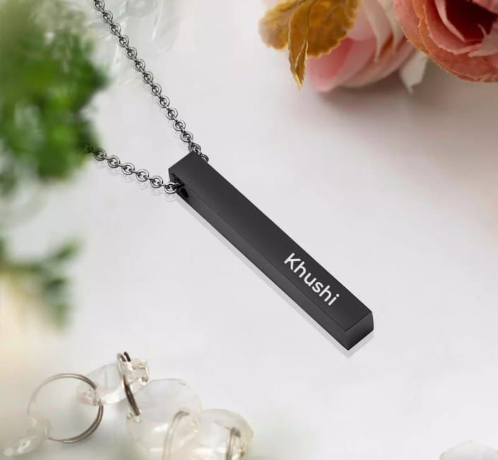 A personalized cuboid name pendant is a special piece of jewelry that has a rectangular shape, like a small box or cube. It's made just for you, with your name or a loved one's name engraved or written on it. This pendant can be worn as a necklace, and it's a unique way to show your identity or give a thoughtful gift to someone special.