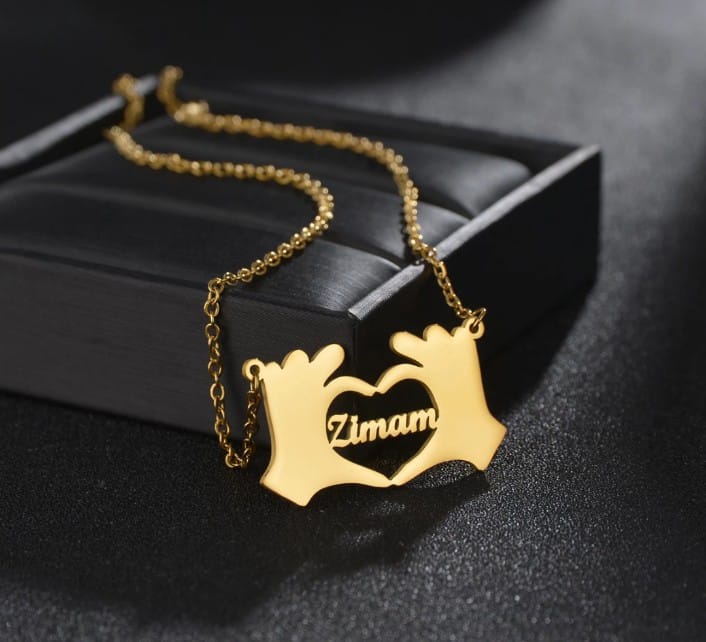 A Personalized Heart Hands Necklace for Women is a special piece of jewelry. It features a heart-shaped pendant with two hands forming a heart shape inside it. You can customize it with your name or a loved one's name. It's a lovely and meaningful necklace that women can wear close to their hearts to show love and affection.